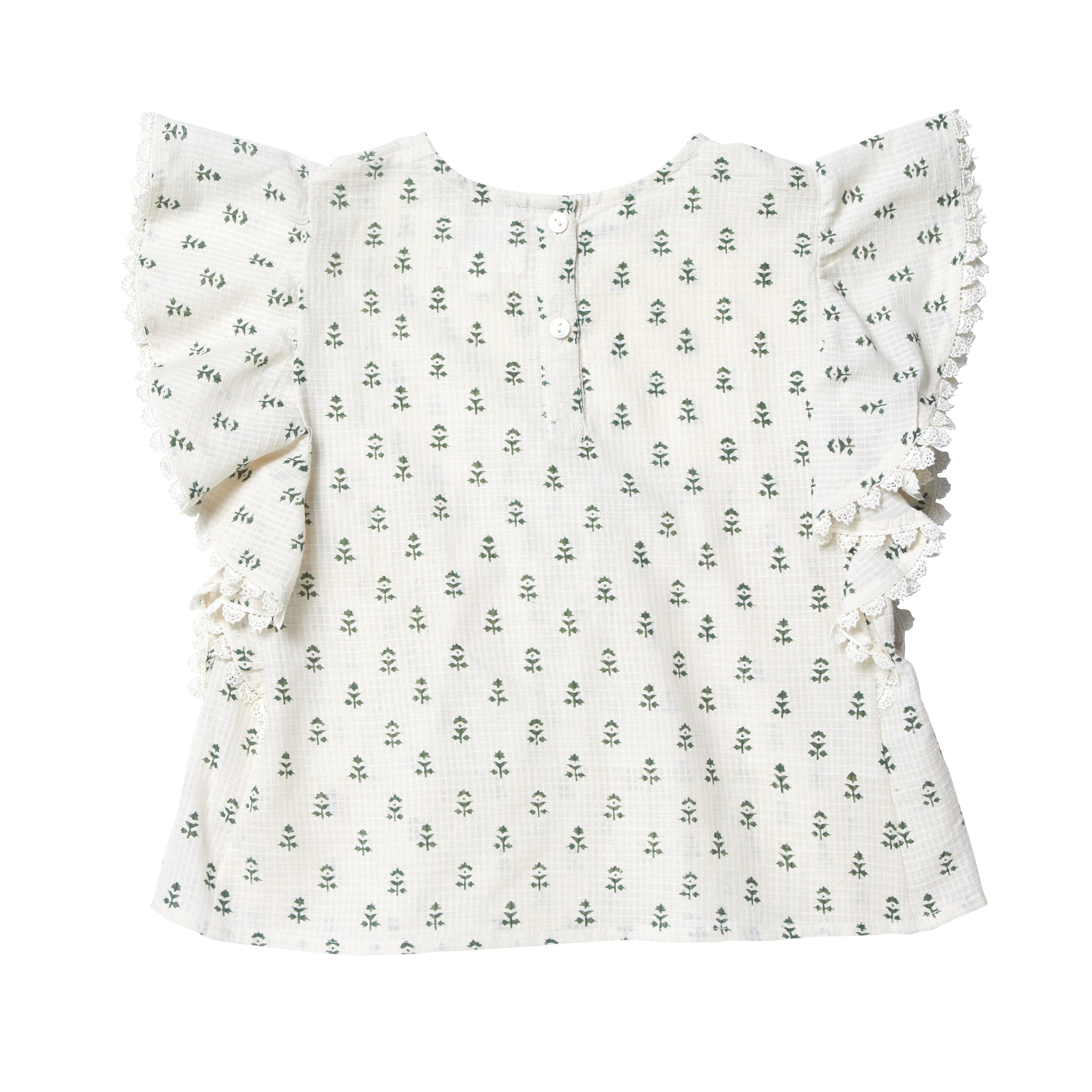 An iconic Bonheur du Jour shape which has proved its worth ... designed on an exclusive and very delicate print. We like its macramé braid on the sleeves and its little gathers which give it a crazy charm.