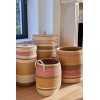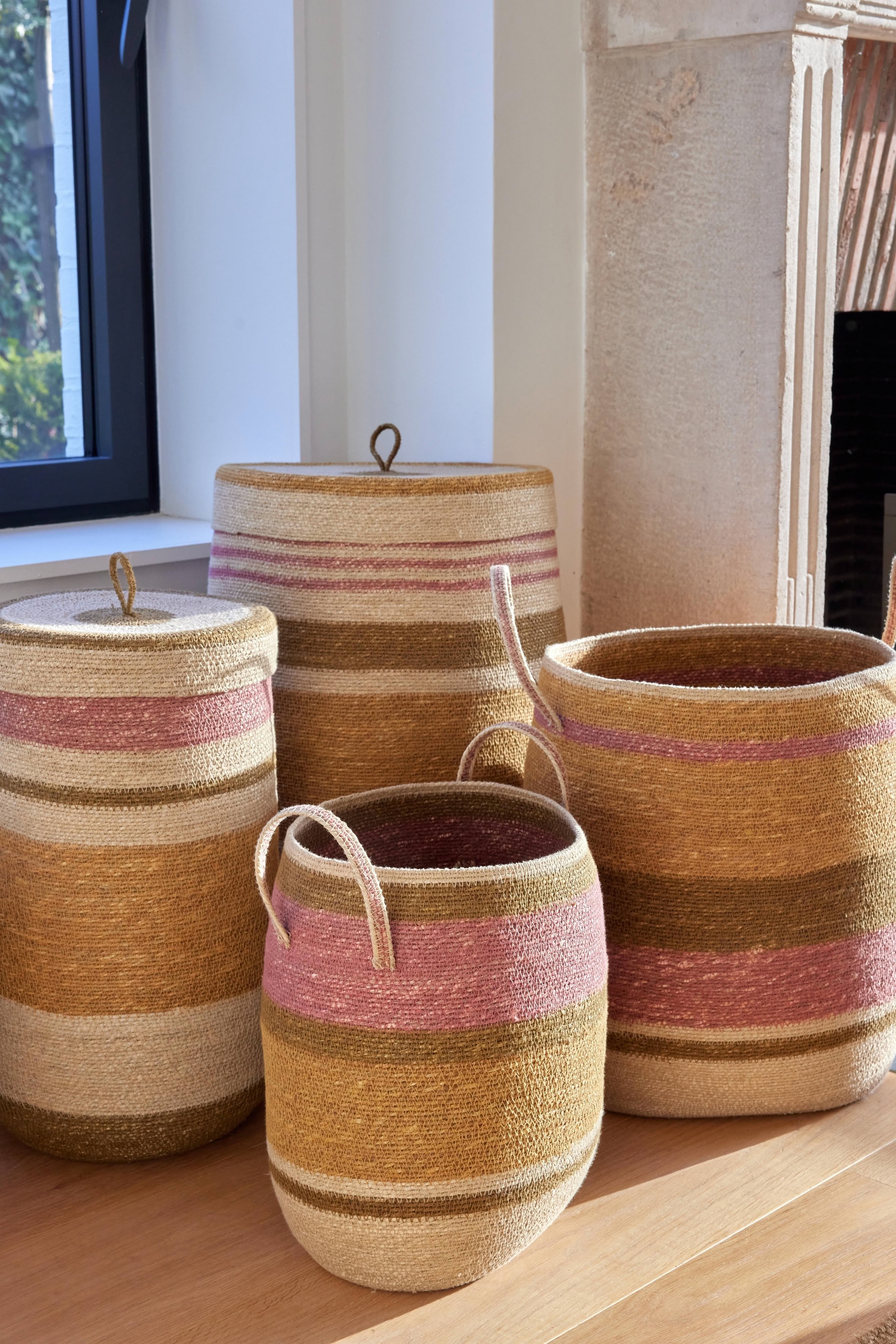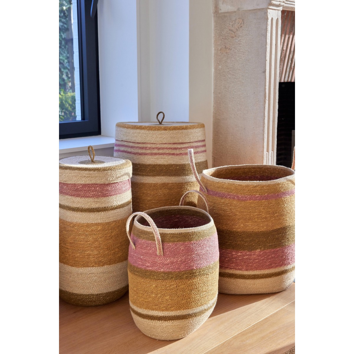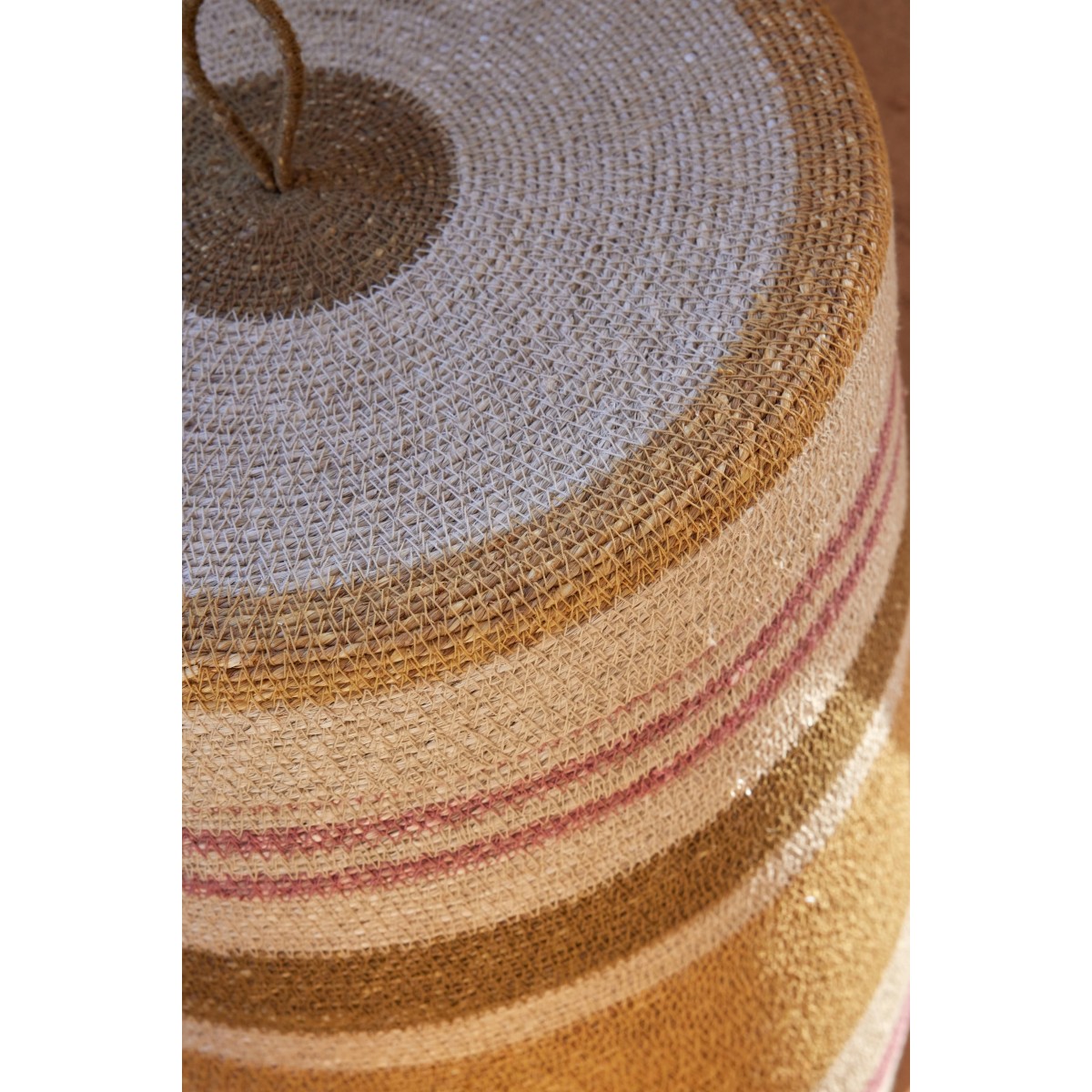 Hand-woven from sea rush and decorated with colorful stripes, it combines practicality with a decorative spirit.
