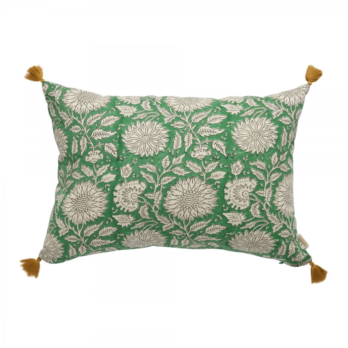 Printed by hand according to the block print craft tradition, this rectangular cover reveals exclusive Indian flowers in a bohemian folk style. Designed in France and carefully sewn in our family workshop in India, it dresses your interior with an authentic and colorful touch.