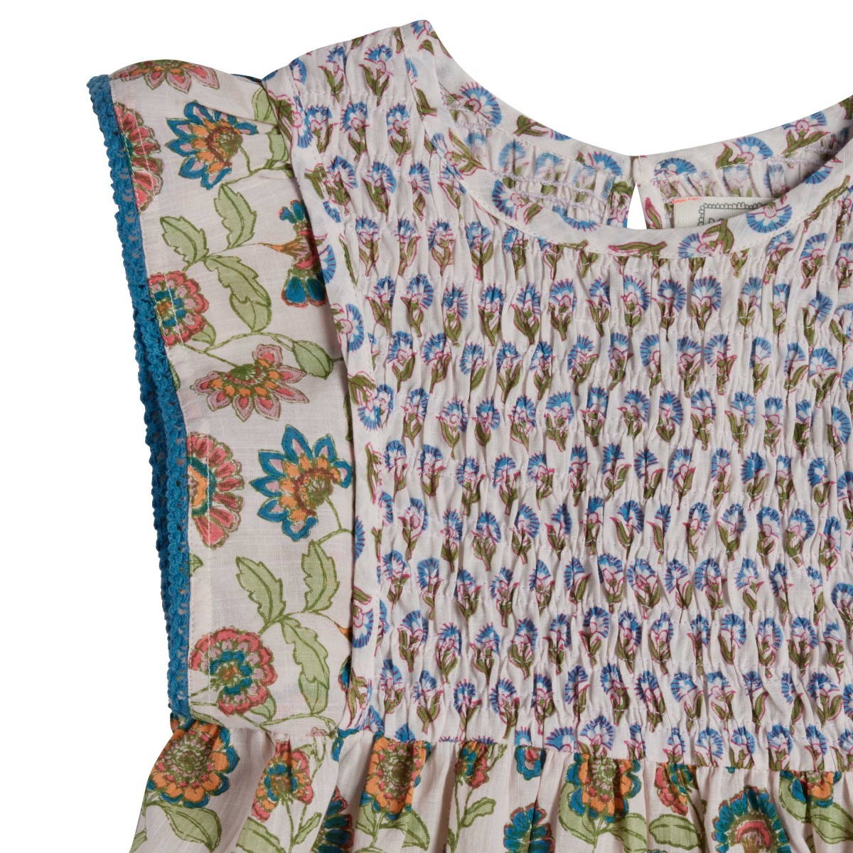 We love the mix-and-match print and smocking on the front and back. Button back.