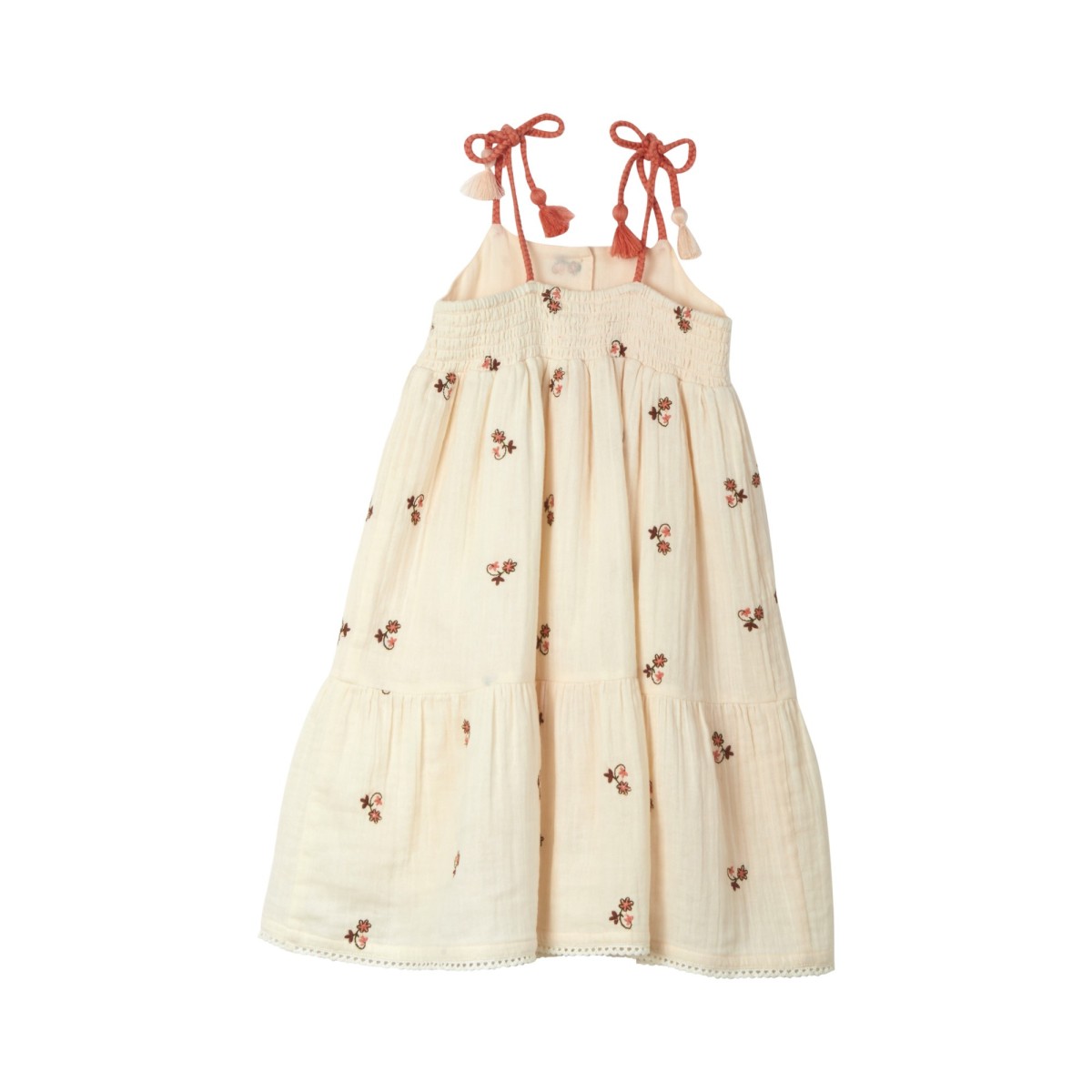 We crush on its delicate embroidered flowers Adjustable straps with colored pompons