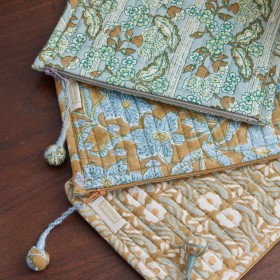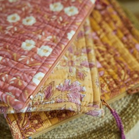 Hand-printed using block printing, it combines softness, functionality and a touch of craftsmanship. Quilted, lined with cotton and decorated with a handmade pompom, it has everything to please.