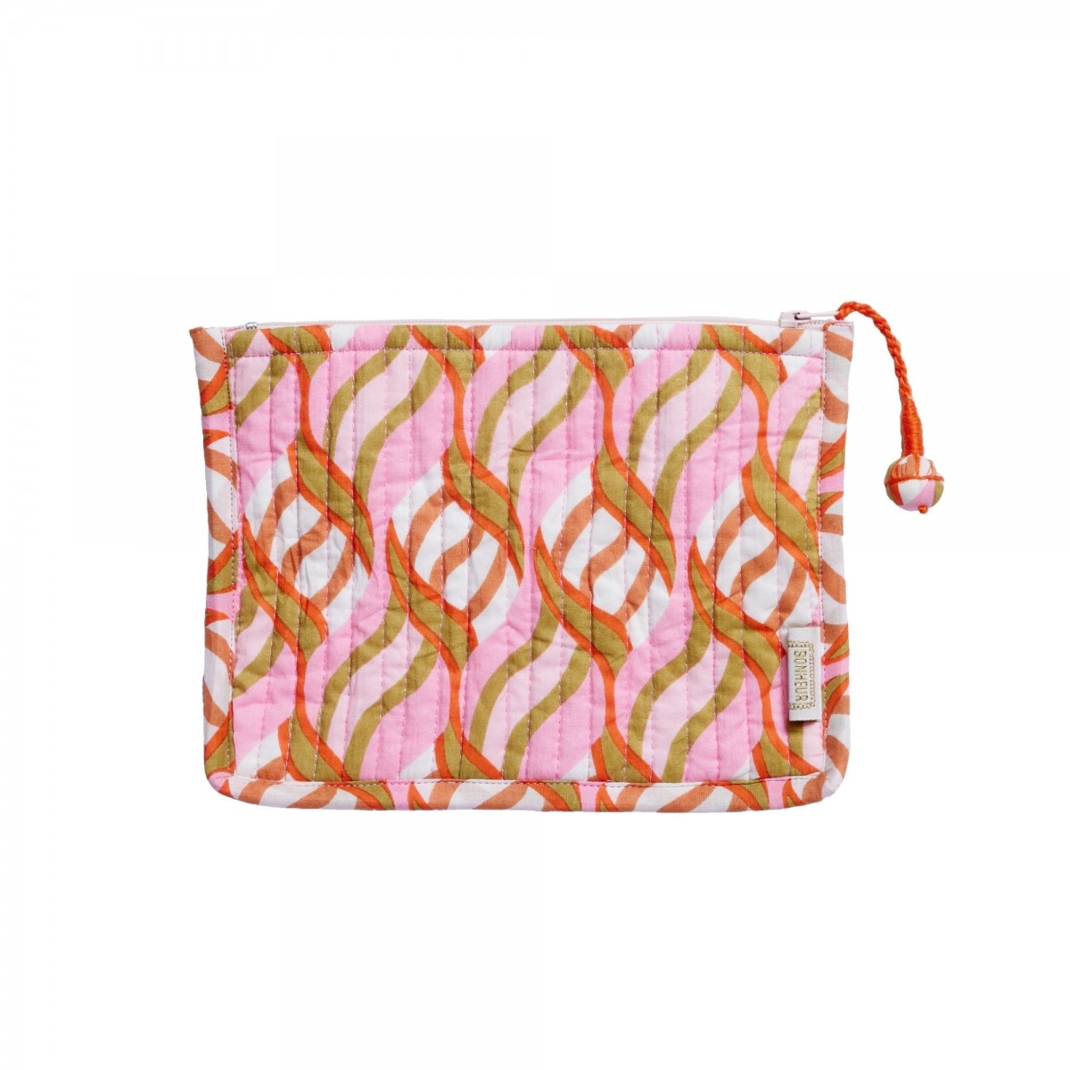 Hand-printed using block printing, it combines softness, functionality and a touch of craftsmanship. Quilted, lined with cotton and decorated with a handmade pompom, it has everything to please.