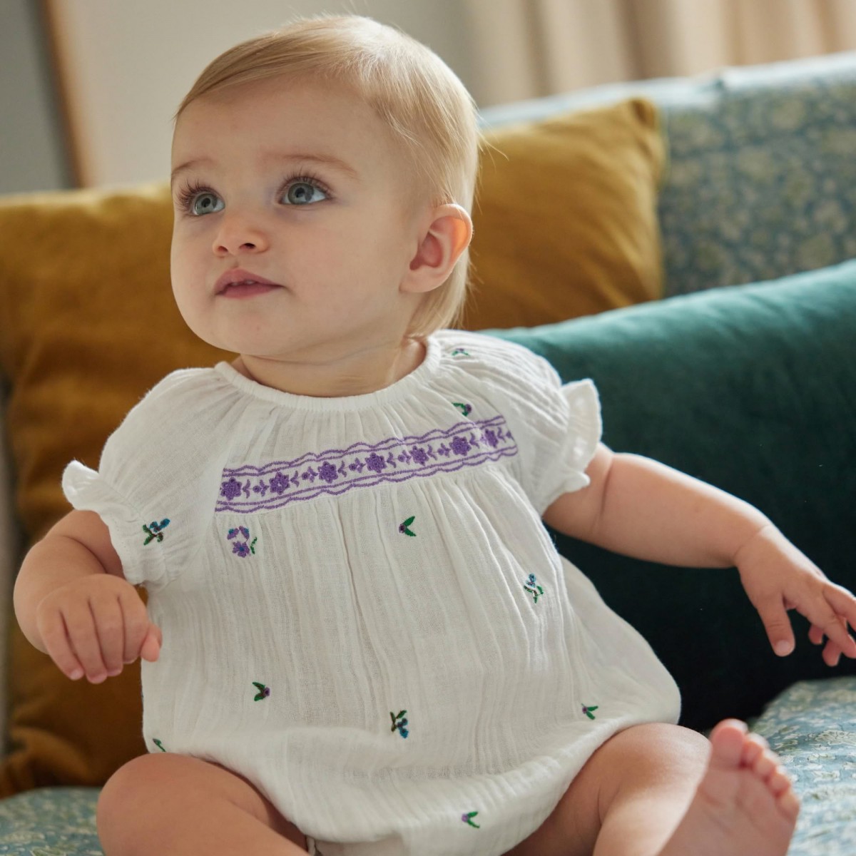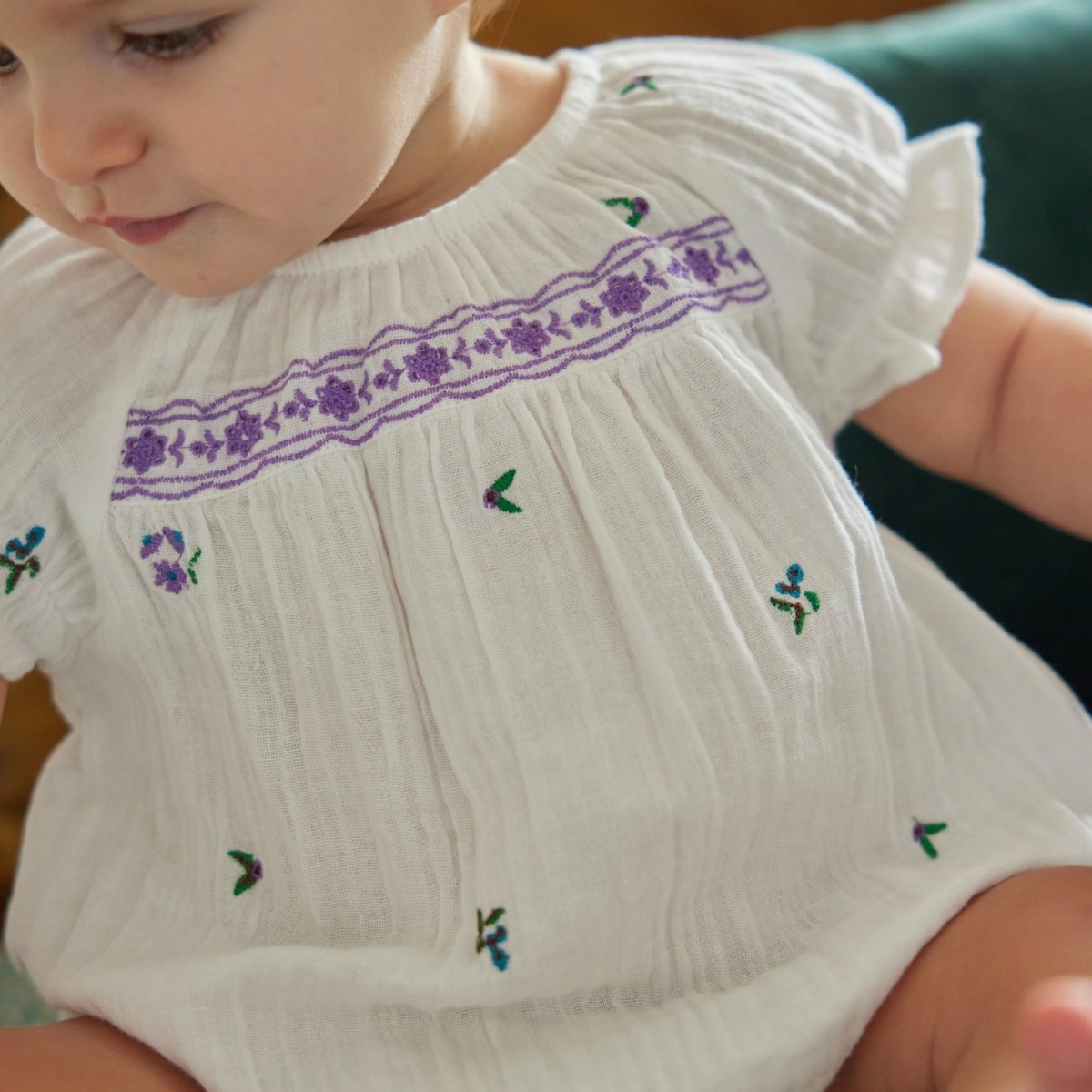 The Gaby baby overall is seductive with its floral embroidery delicately placed on the front yoke and entirely designed by our team.