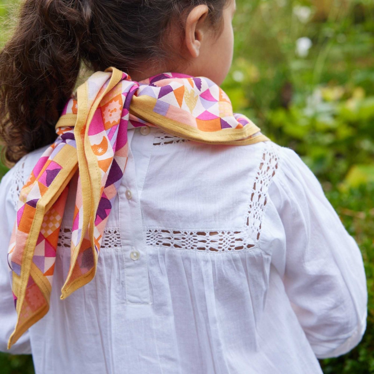 Designed for kids, but not only: this 60 x 60 cm scarf accompanies children to school, to the beach or on walks, and can also be worn as a bandana in the hair, around the neck or attached to a bag.