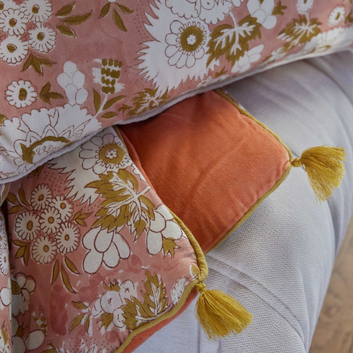 Bohemian Indian flowers printed with the block print on one side, revealing Indian craftsmanship. Stripes on the other side.