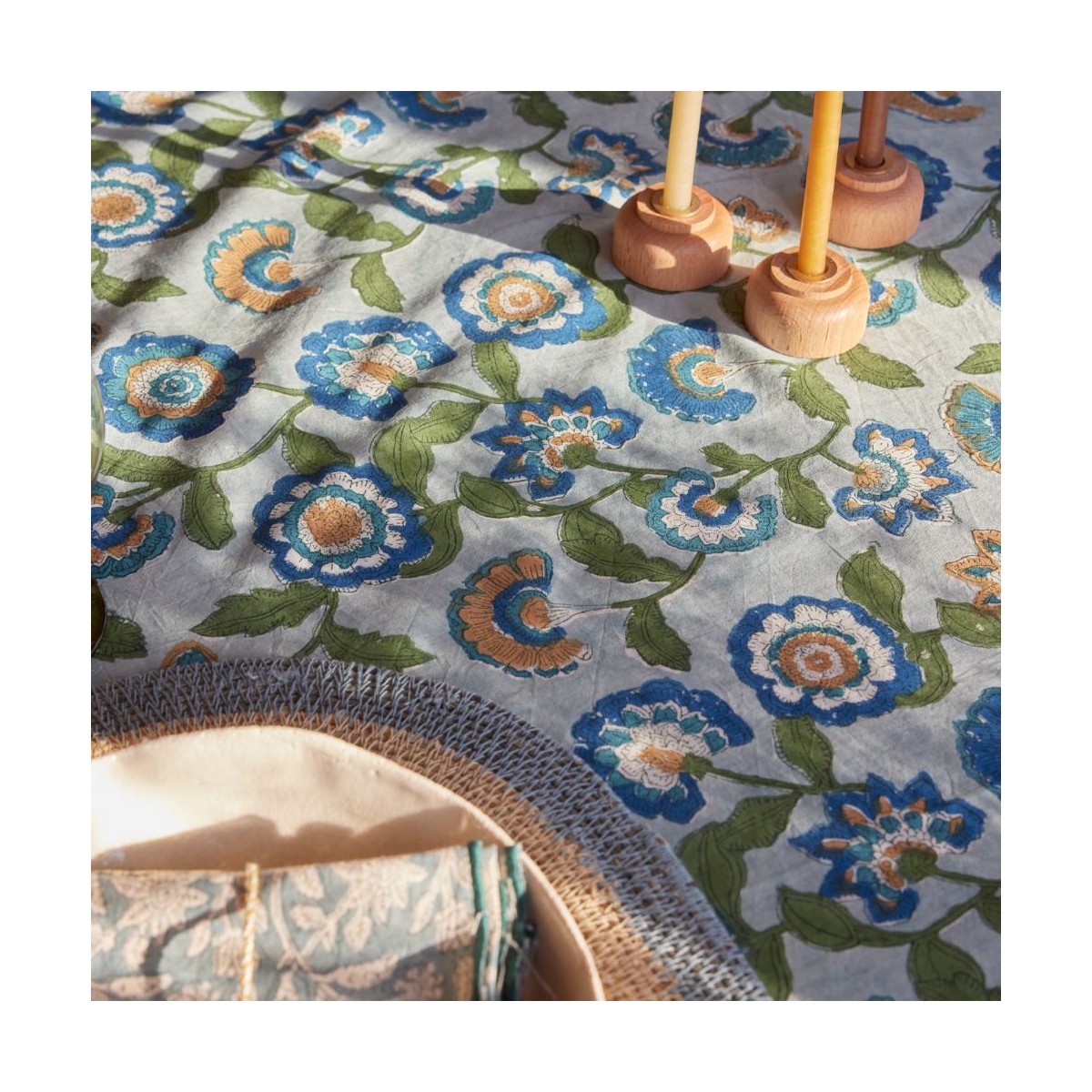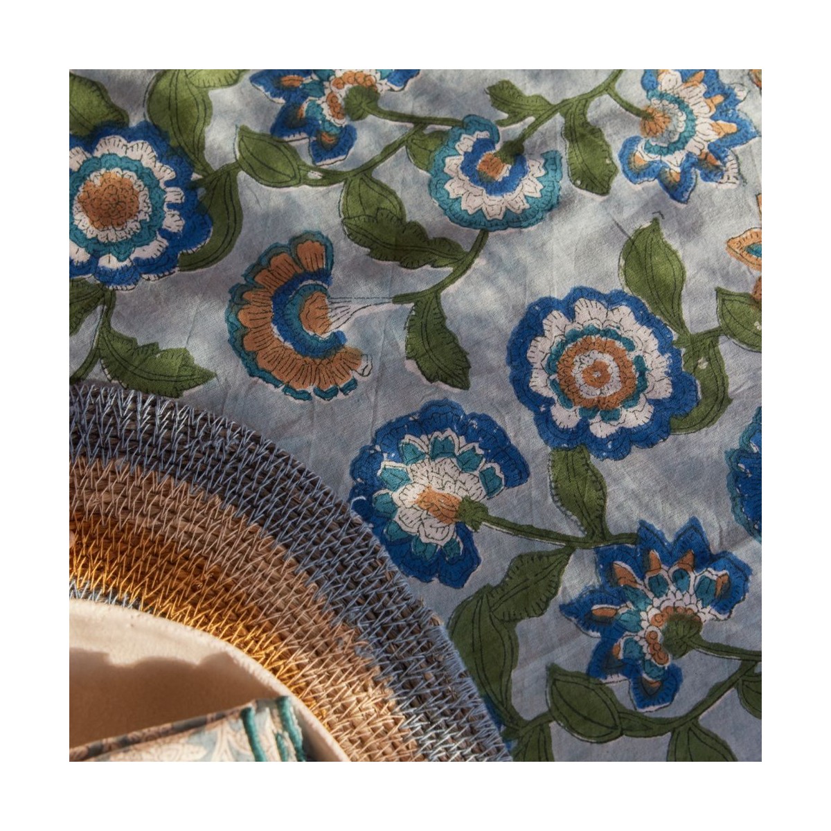 Its floral motif created in Jaipur using the traditional block print technique. Each motif is applied by hand using finely carved wooden stamps. It's a slow-paced printing process that lends relief to the motif, micro irregularities that we love, and a real soul to the piece.