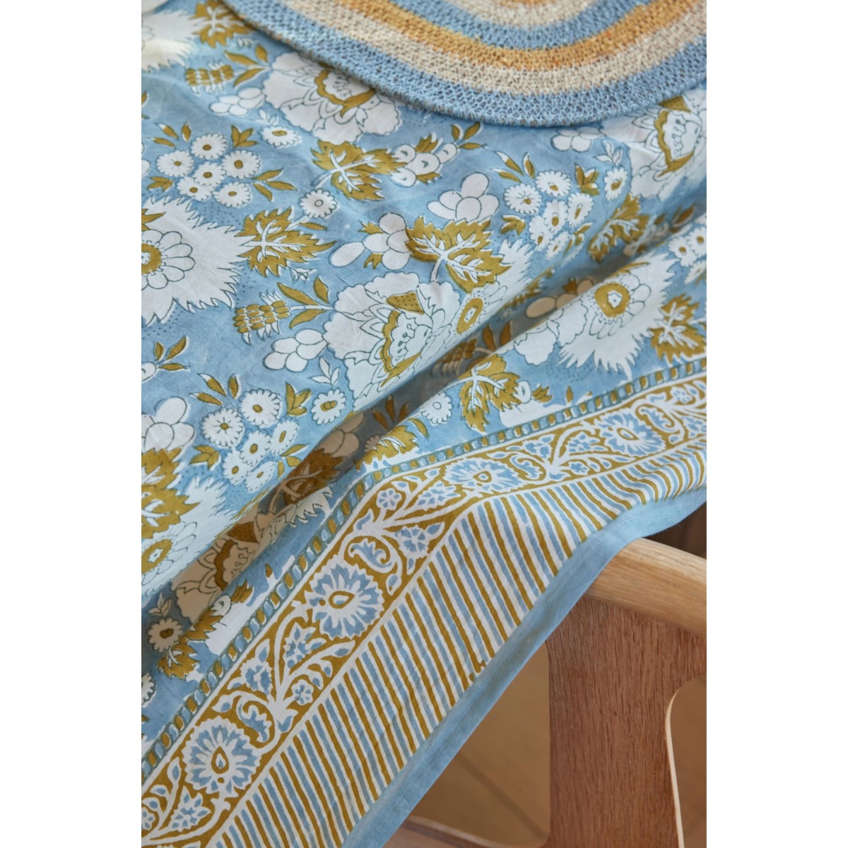 Its floral motif created in Jaipur using the traditional block print technique. Each motif is applied by hand using finely carved wooden stamps. It's a slow-paced printing process that lends relief to the motif, micro irregularities that we love, and a real soul to the piece.