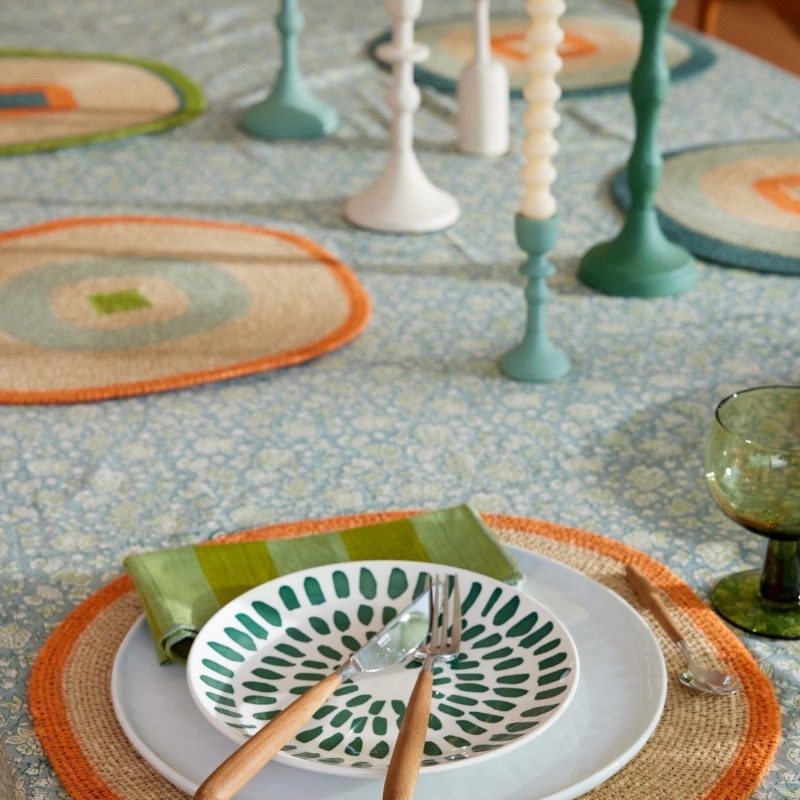Place on a large table for family meals or lunches with friends, in the garden or indoors. It lends itself to all occasions and can be mixed and matched with our printed napkins, sea rush placemats and colorful candleholders. A cheerful, bohemian spirit to match your mood.