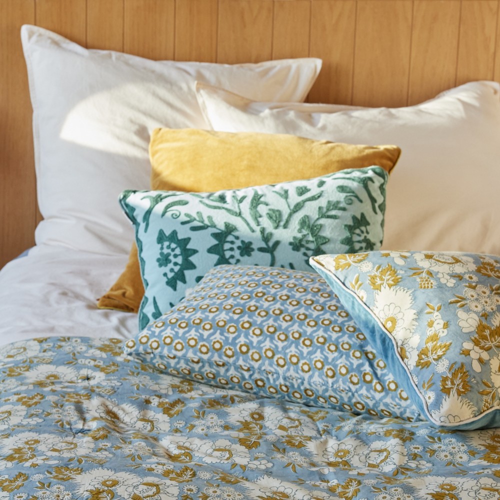 Ce motif « exclusif » au folklore sans précédent a été dessiné par notre talentueuse styliste déco et brodé à la main par nos amis artisans indiens.