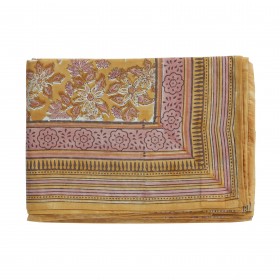 Son motif floral a été réalisé à Jaipur selon la technique artisanale du block print. Chaque motif est apposé à la main à l’aide de tampons de bois finement sculptés. Une impression au rythme lent, qui donne du relief au motif, des micro-irrégularités qu’on adore, et une vraie âme à la pièce.