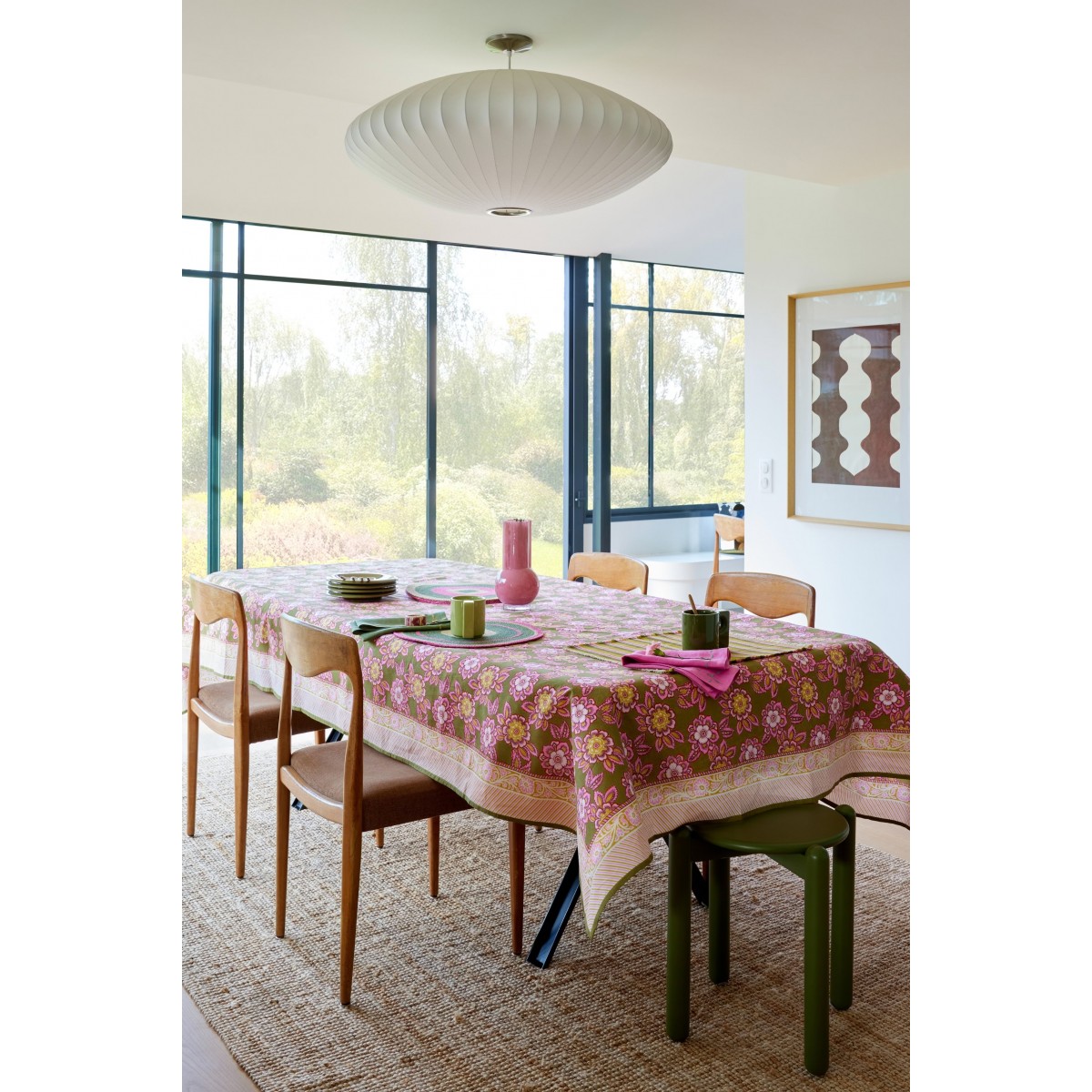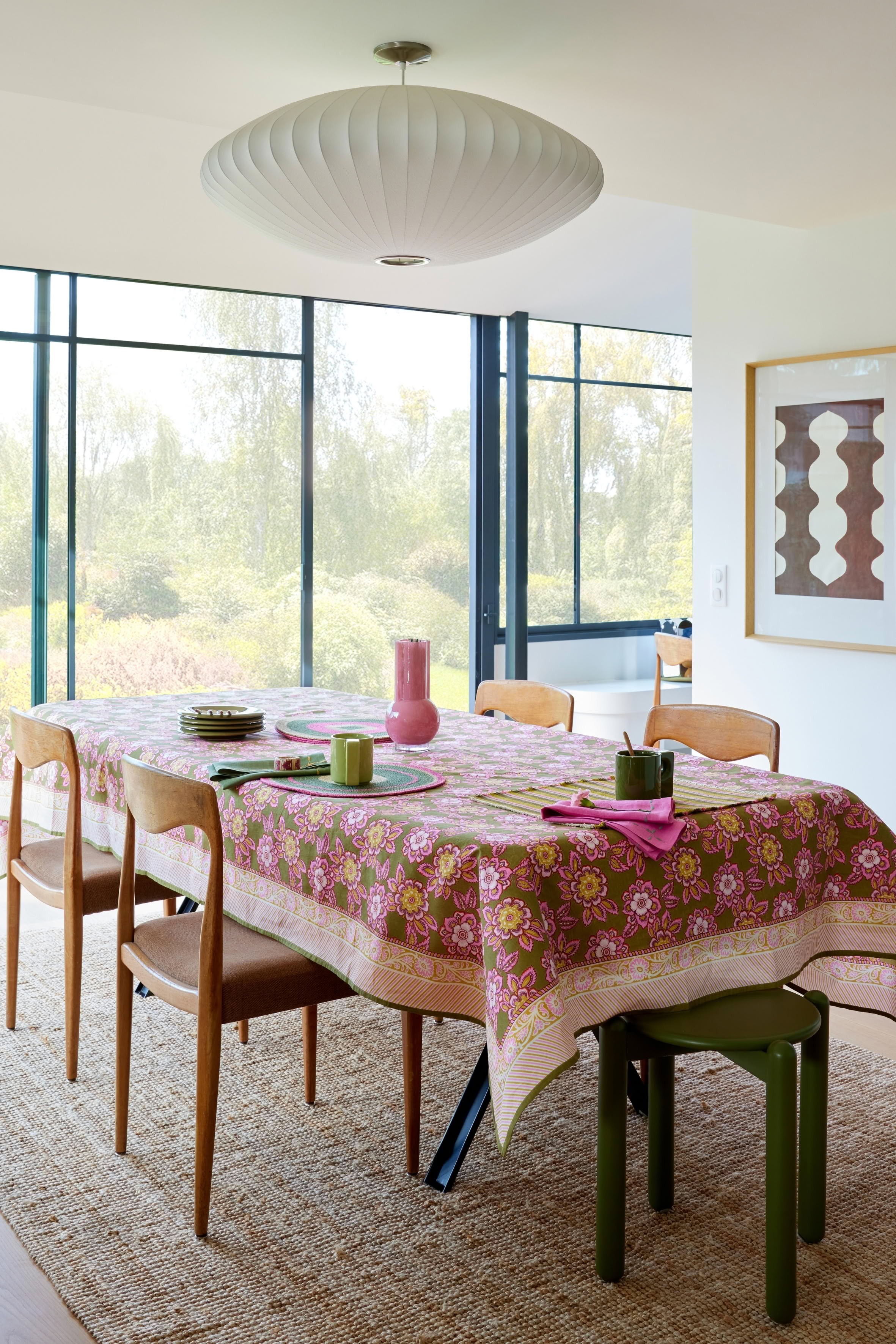 Les frises contrastées encadrent la nappe comme un cadre graphique, pour une table à la fois chaleureuse et solaire.