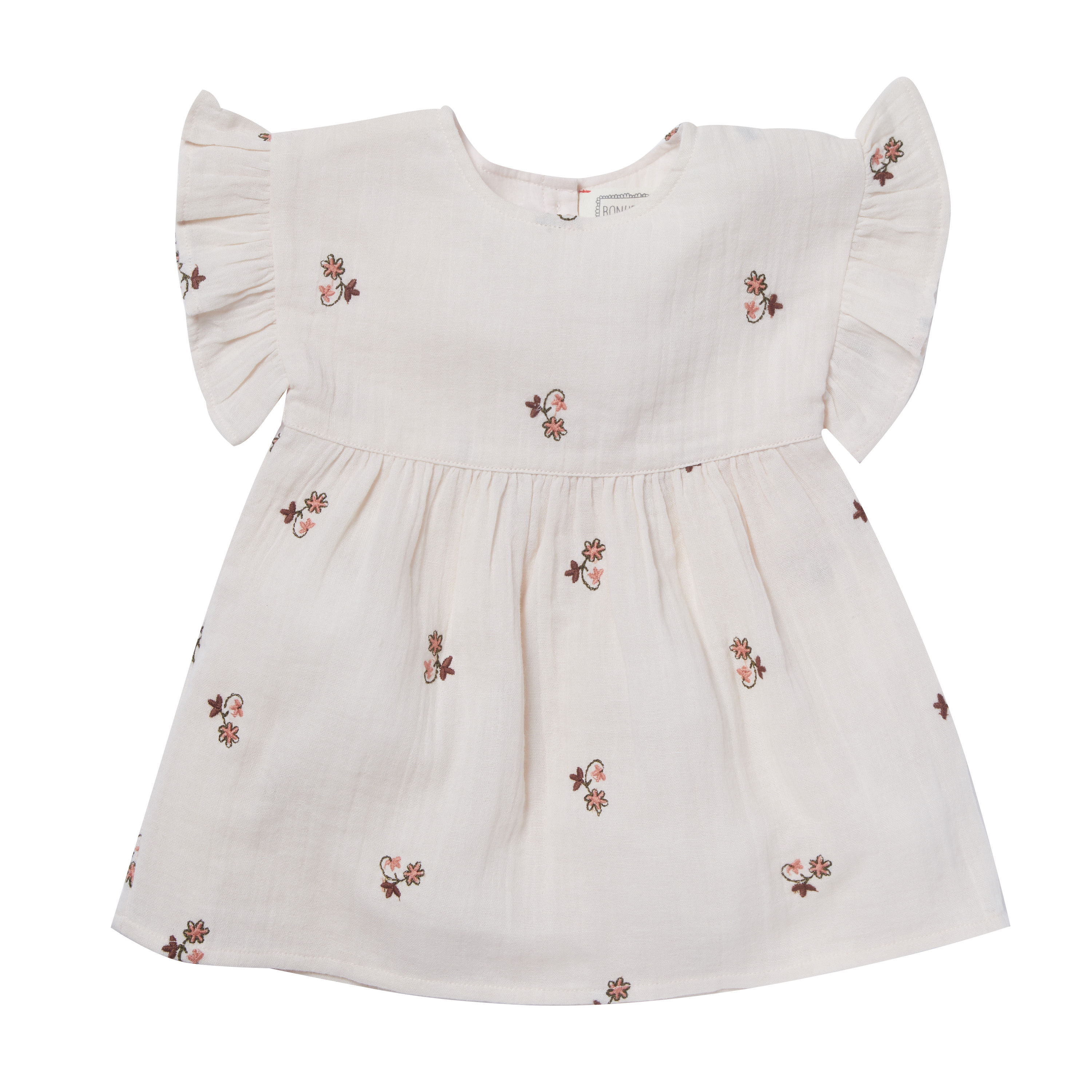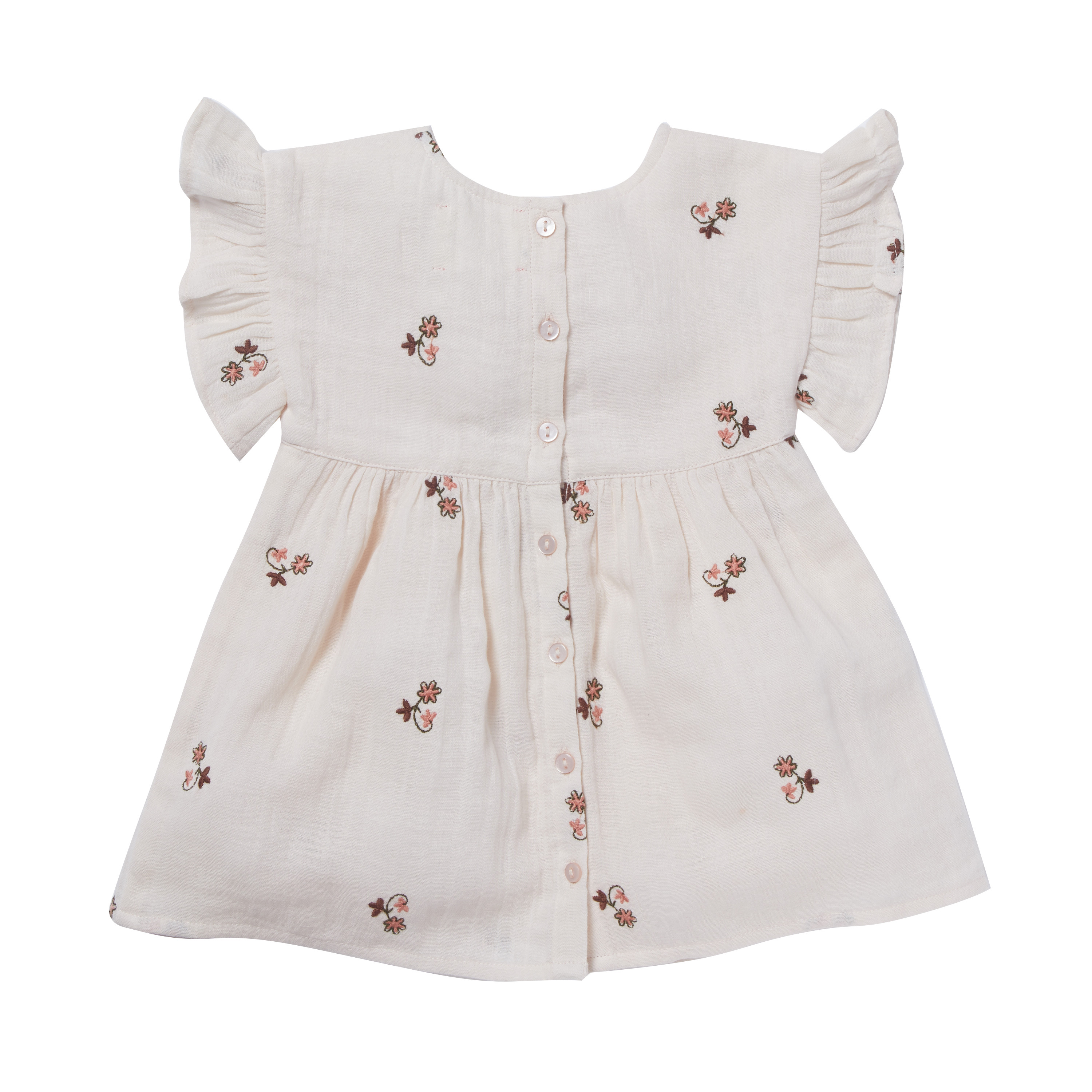 Robe brodée esprit bohême Manches volantées et empiècement froncé sur une robe courte pour un porter un brin rétro Boutonnée au dos. On adore ses délicates fleurs brodées originales qui font la marque de fabrique de la marque Double gaze toute douce et brodée doublure sur empiècement devant et dos en voile 100 % coton.