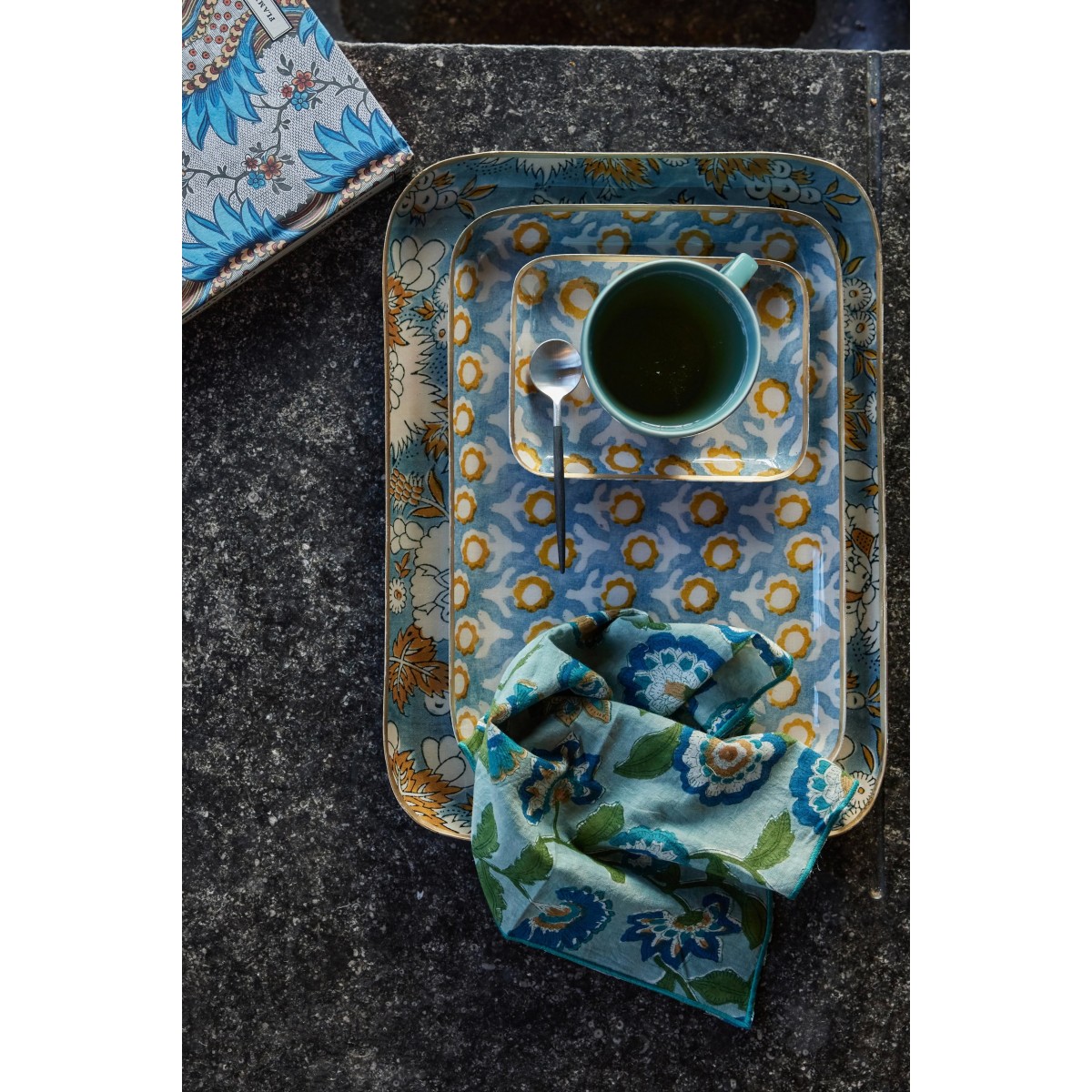 Plateaux conçus en métal émaillé avec une bordure dorée à la main. C’est une pièce unique, façonnée des mains des artisans Indiens ce qui lui confère des irrégularités.