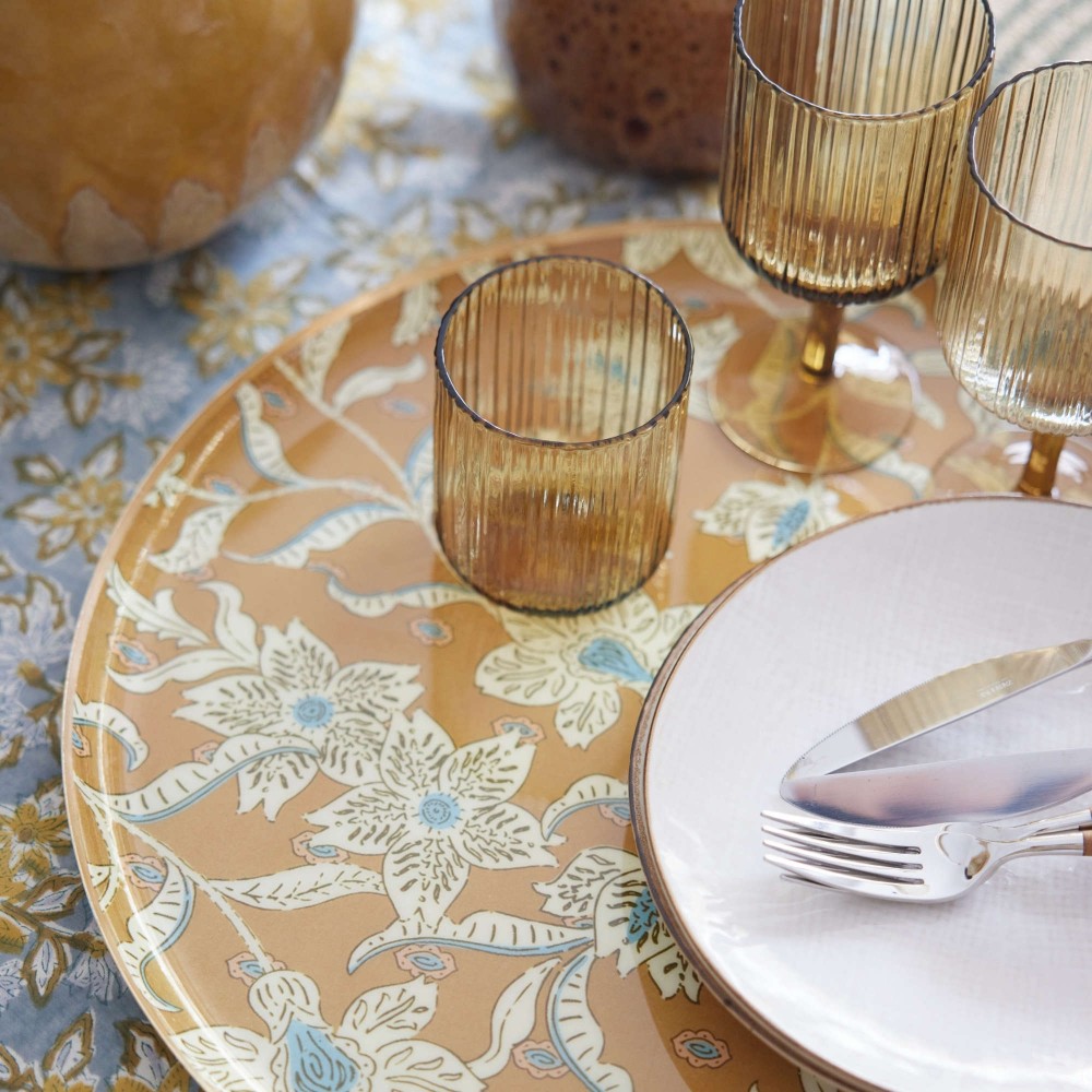 Chaque pièce est unique : la bordure dorée est appliquée à la main par des artisans indiens, offrant des petites irrégularités qui font tout leur charme et leur authenticité.