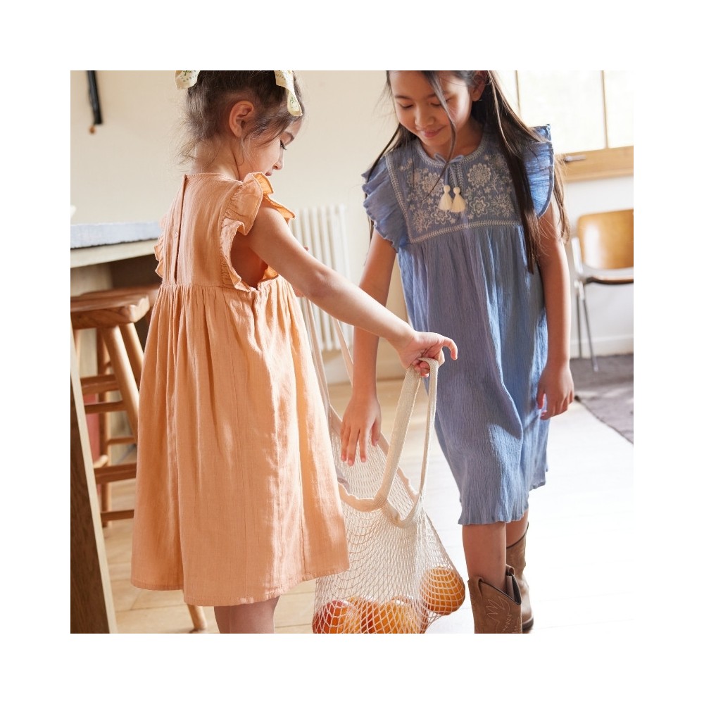 Chambray bleu ou double gaze pur coton créponné doublés d’un voile de coton.