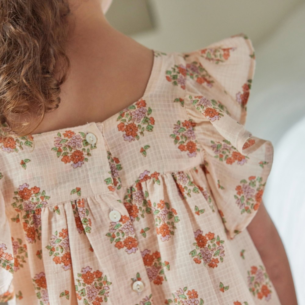 Entièrement froncée et boutonnée dans le dos, elle offre une coupe fluide et confortable, parfaite pour les journées ensoleillées. Un modèle poétique et lumineux, à porter dès les premiers beaux jours.