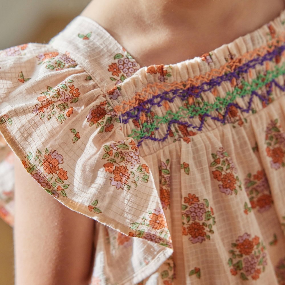 Robe fille à smocks à fleurs rose