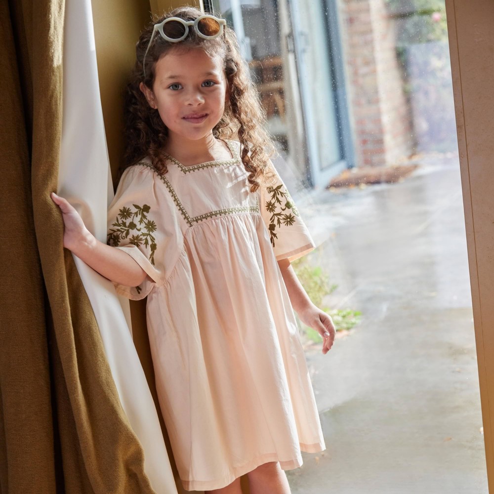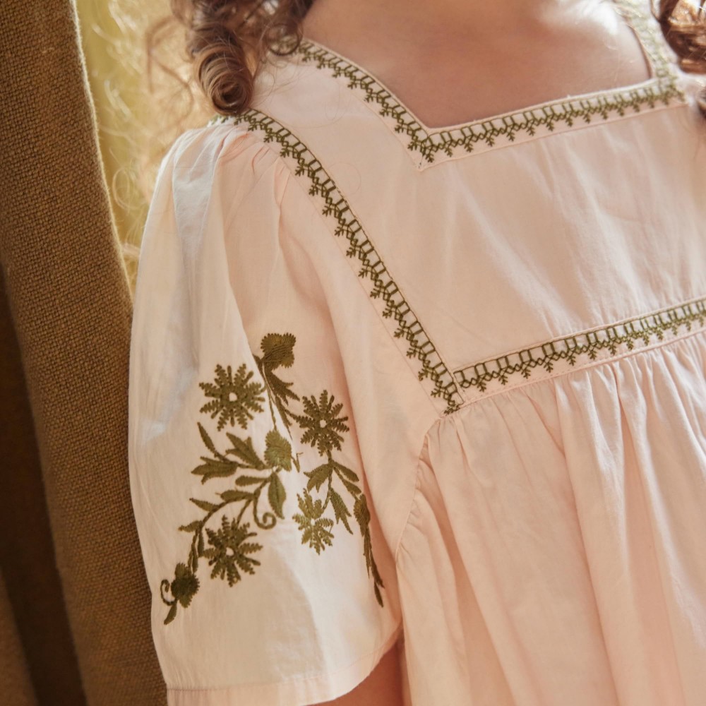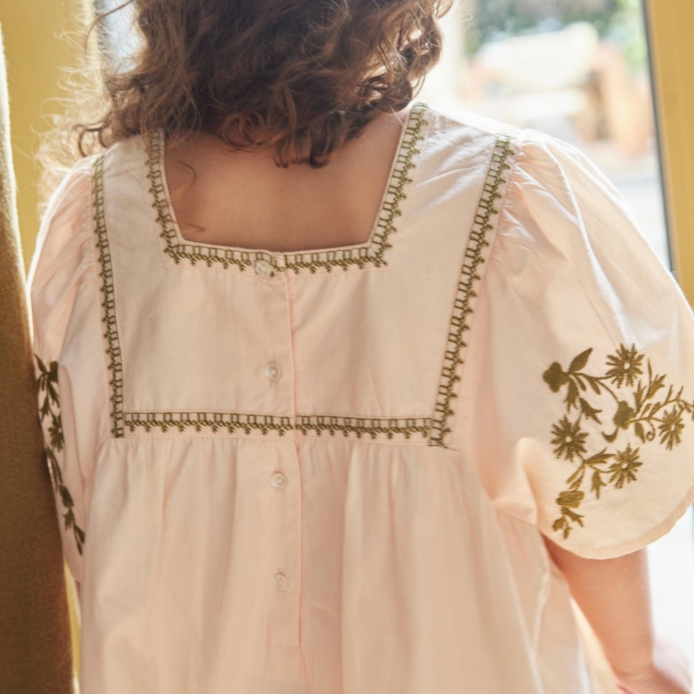 La robe Augustine séduit par sa silhouette ample et son charme bohème délicatement brodé.