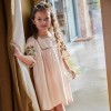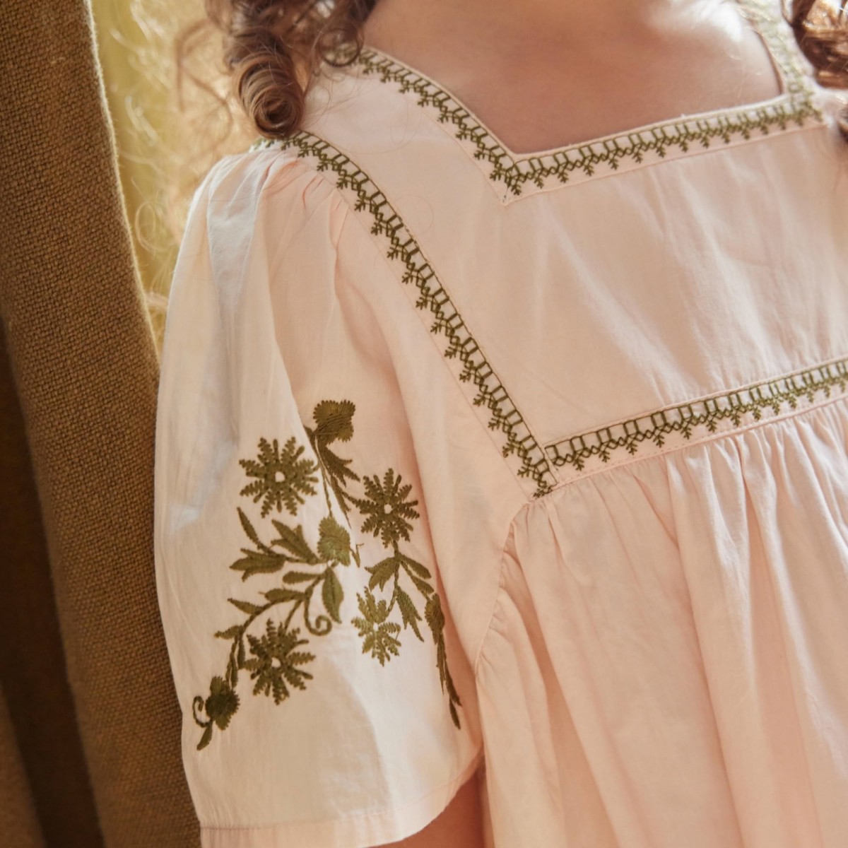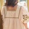 Son joli décolleté est souligné d’une frise brodée aux accents ethniques, tandis que les manches volantées sont ornées d’un florilège de fleurs finement brodées.