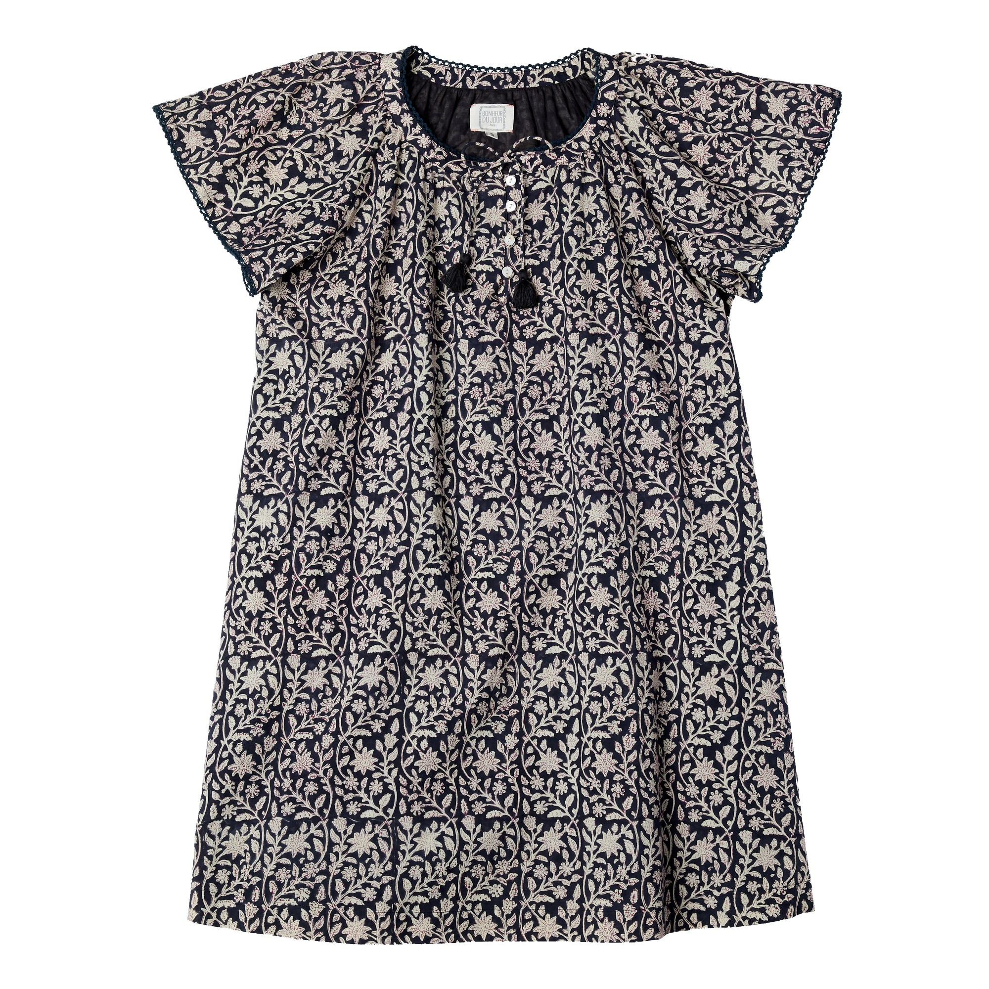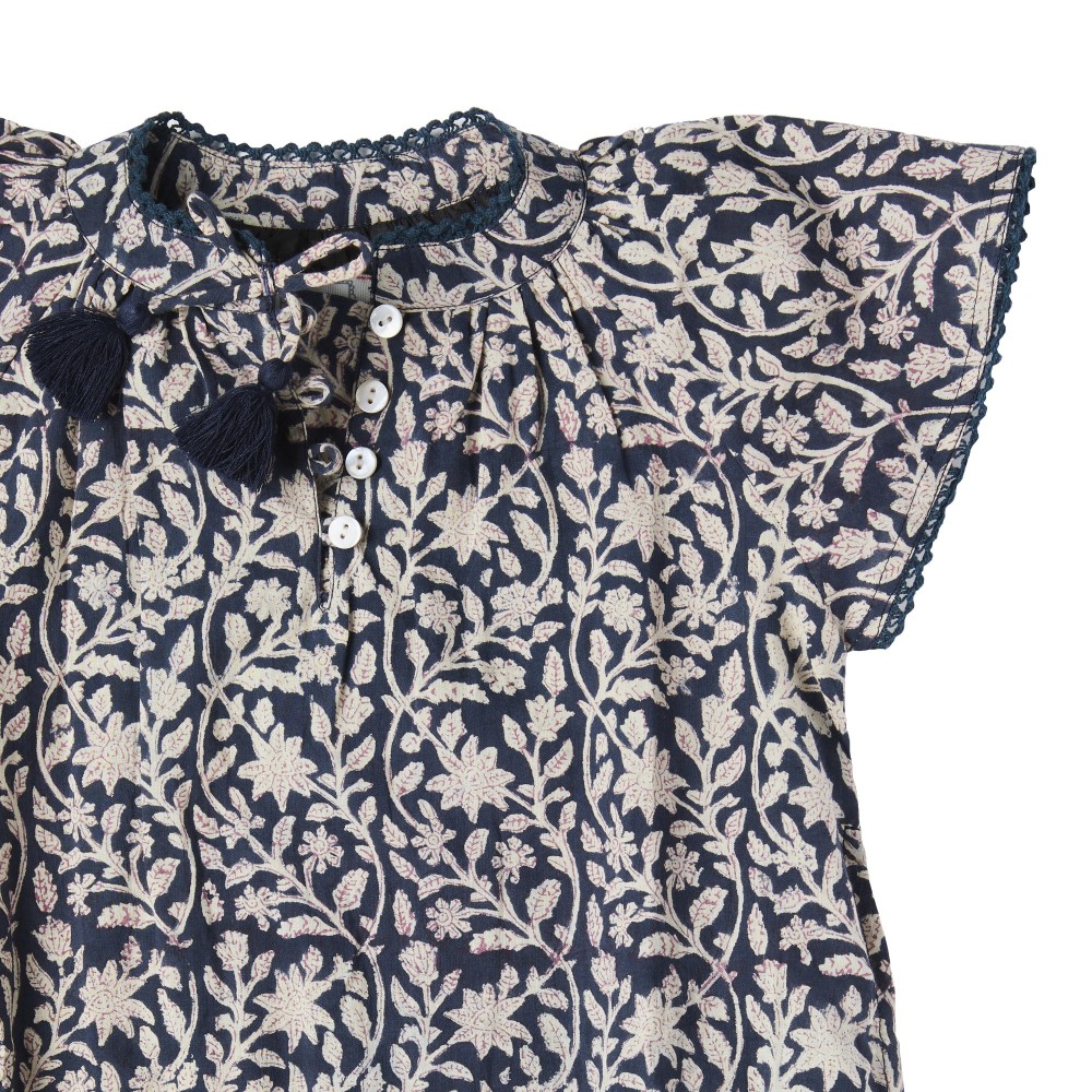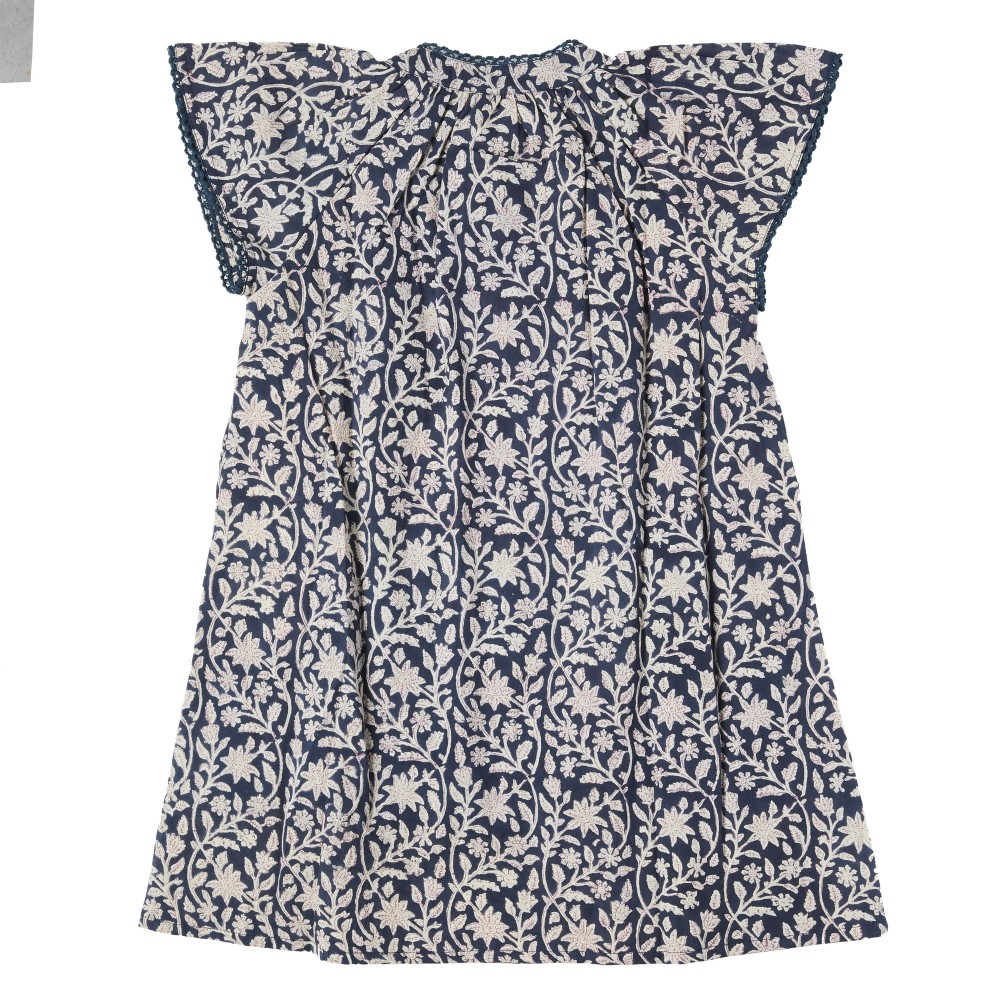 On aime son motif fleurs imprimées avec la technique d’impression « fait main » au block print.
