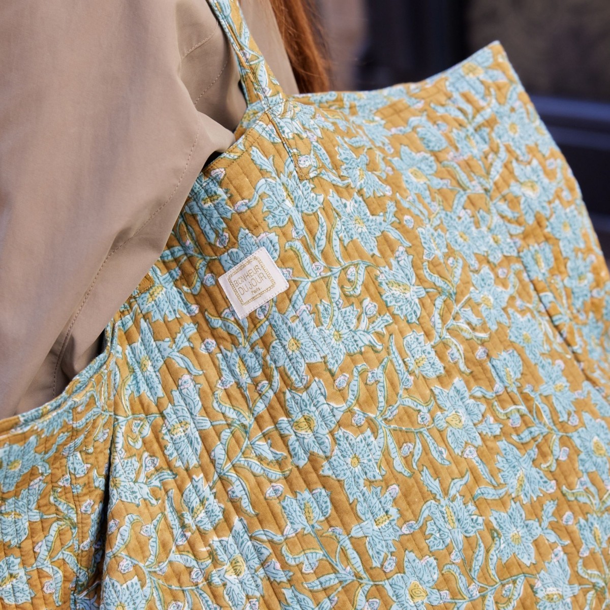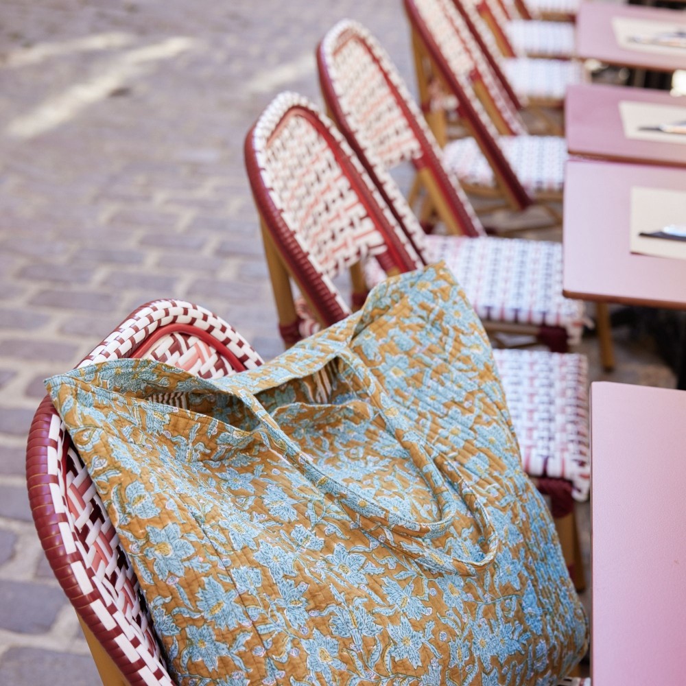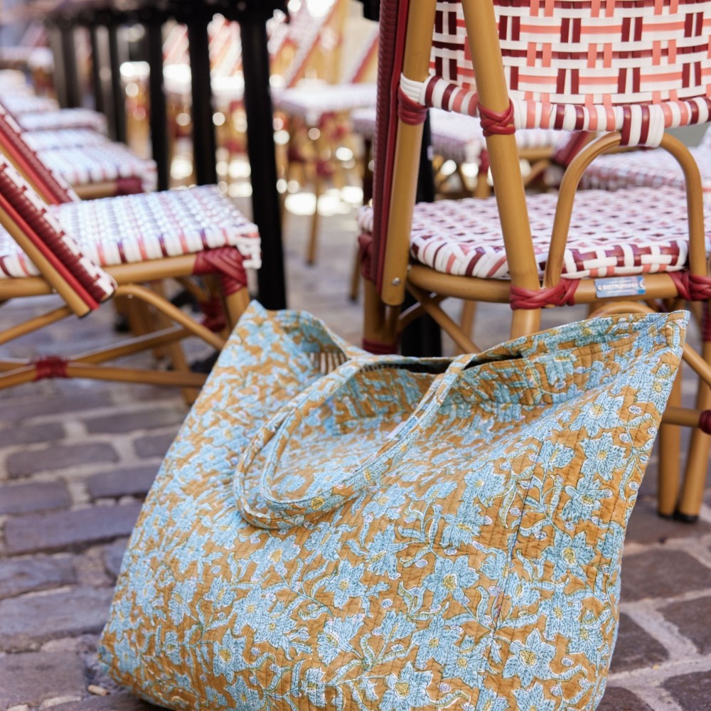 Chaque modèle est imprimé à la main à l’aide de tampons en bois, avec des pigments naturels. Un choix durable, un geste pour la planète et une vraie touche d’âme en plus.